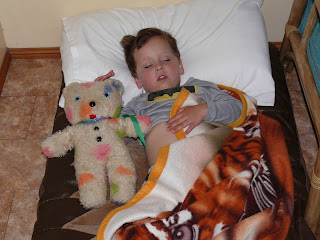 PD is (obviously) a teddy bear. He hasn't always looked like that, but he has ever since I've known him. He was Anthony's when he was a little boy (sadly, I don't have a picture), and when Samuel was born, Anthony passed PD on to him. I can't find any pictures of Sam with PD either, but here's one of him asleep with PD in the background:
